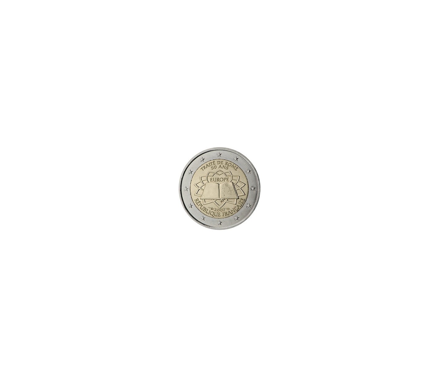 Description : la pièce montre le traité signé par les six pays fondateurs, avec en arrière-plan le motif du dallage (dessiné par Michelangelo) de la Piazza del Campidoglio à Rome, où a eu lieu la cérémonie de signature le 25 mars 1957. Les inscriptions « TRAITE DE ROME 50 ANS » et « EUROPE » ainsi que le nom du pays émetteur apparaissent dans les langues respectives de la zone euro ou en latin. Par conséquent, la légende diffère d’un pays à l’autre, mais le dessin est le même. Le traité de Rome a institué la Communauté économique européenne et a préparé la voie de l’introduction de l’euro en 1999 et des billets et pièces en euros en 2002. L’anniversaire sera célébré le 25 mars 2007. À cette occasion, les pays de la zone euro ont décidé d’émettre conjointement cette pièce commémorative. Son dessin a été choisi à l’issue d’un concours organisé par les hôtels des monnaies européens. Les douze étoiles de l’Union européenne sont représentées dans l’anneau externe de la pièce.