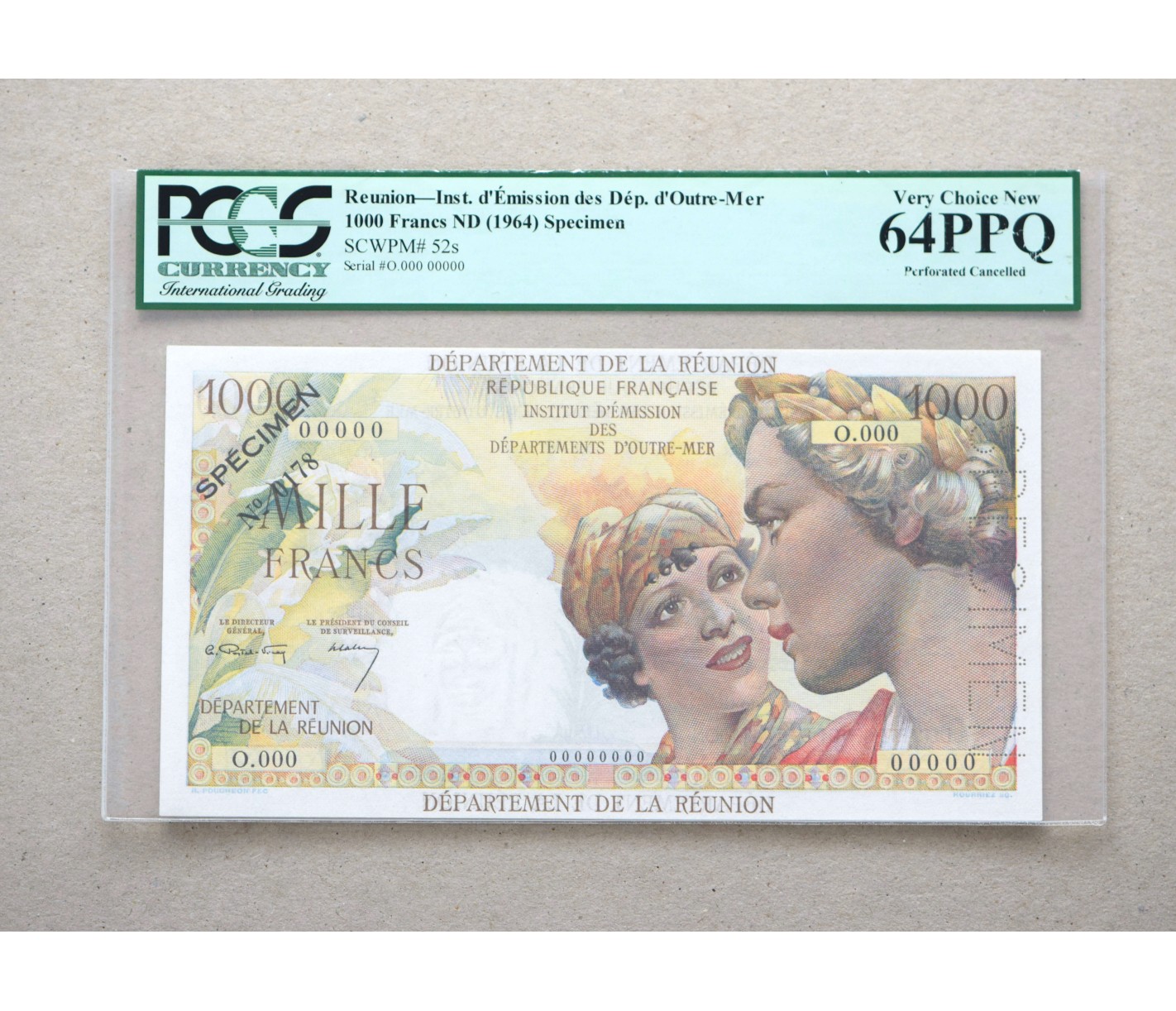 Le 1000 Francs Union Française – Île de la Réunion 1964 (P.52s) est un billet spécimen exceptionnel, émis par la Banque de l’Île de la Réunion sous l’autorité de l’Union Française. Cette version « Spécimen » n’a jamais circulé et servait uniquement à des fins de présentation ou de test d’impression.