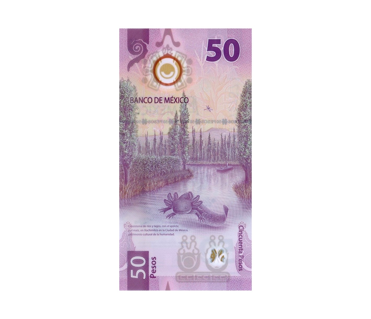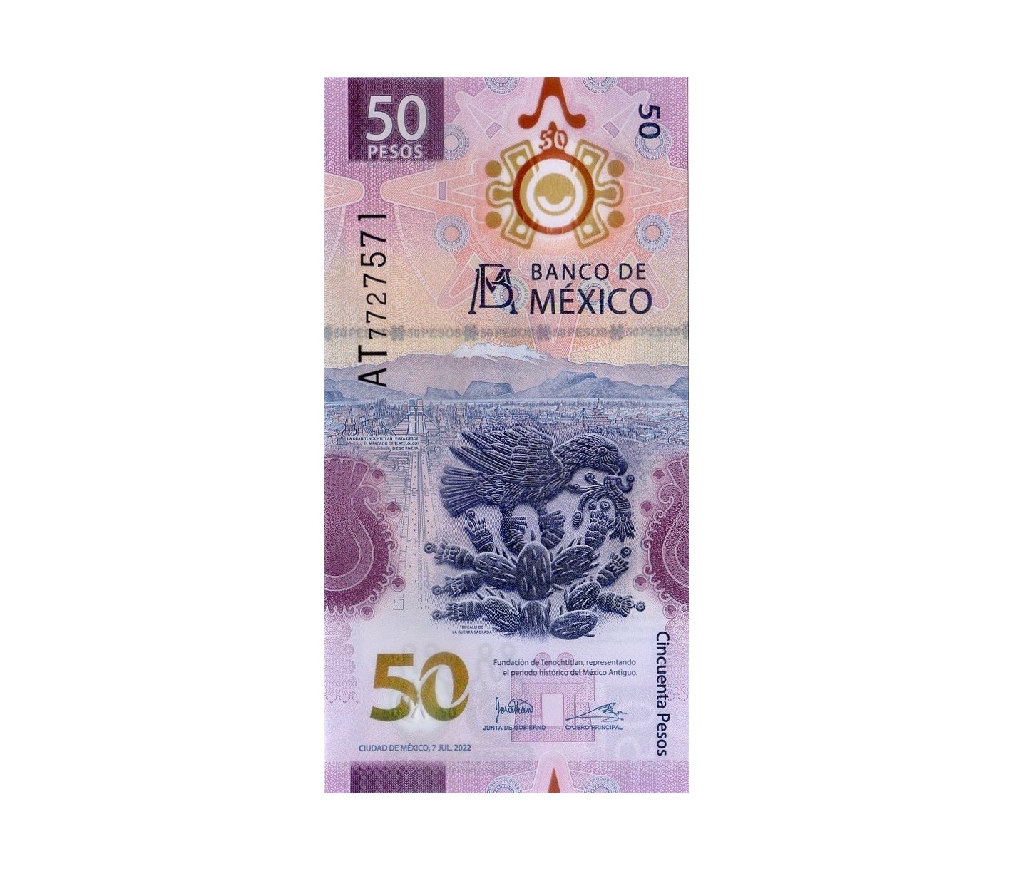 Le billet de 50 Pesos Mexique 2022 (P.133) est une émission contemporaine de la Banque du Mexique, illustrant la richesse culturelle et la beauté naturelle du pays. Fait en polymère, il se distingue par son design coloré, sa durabilité et ses éléments de sécurité de dernière génération.