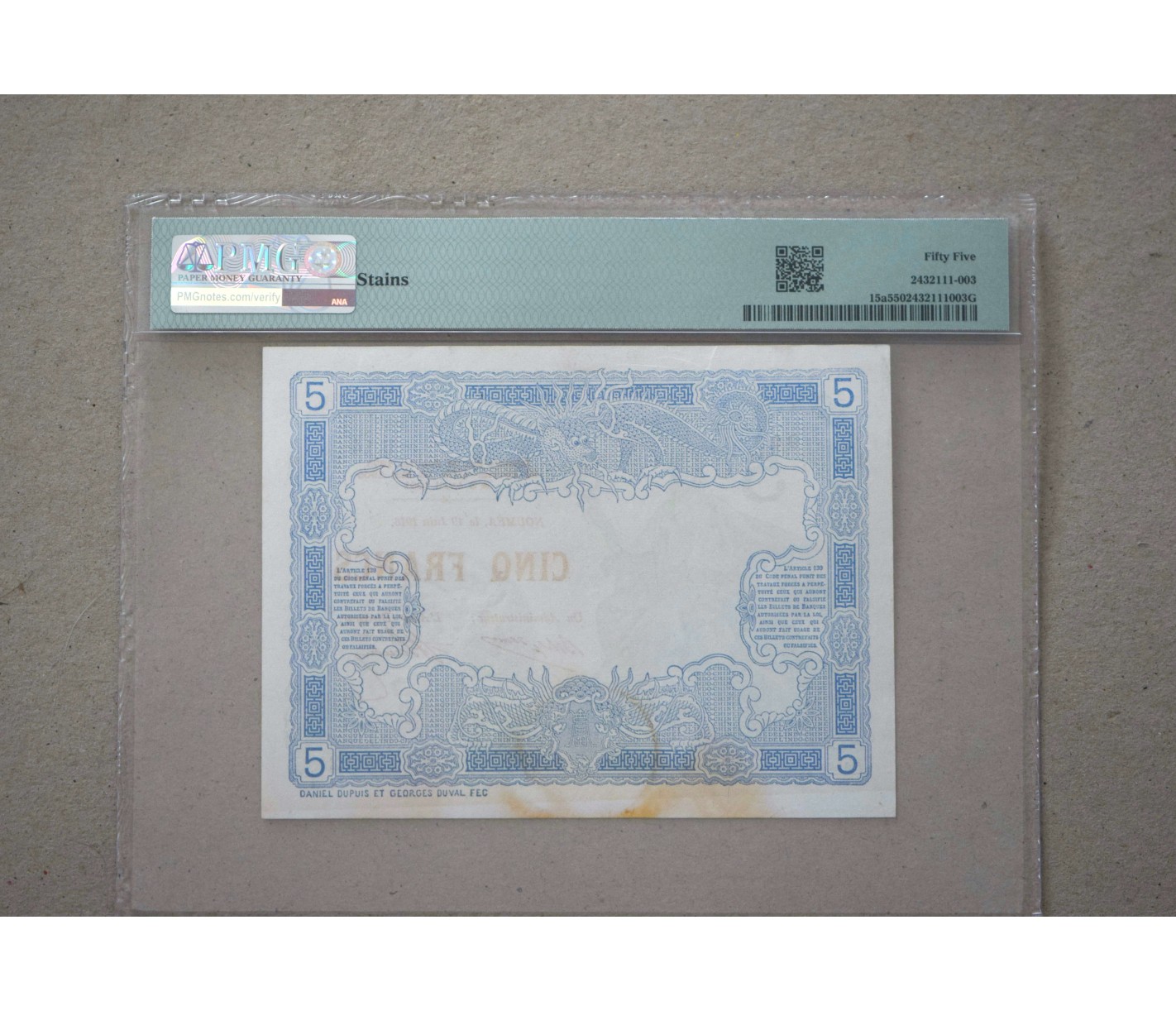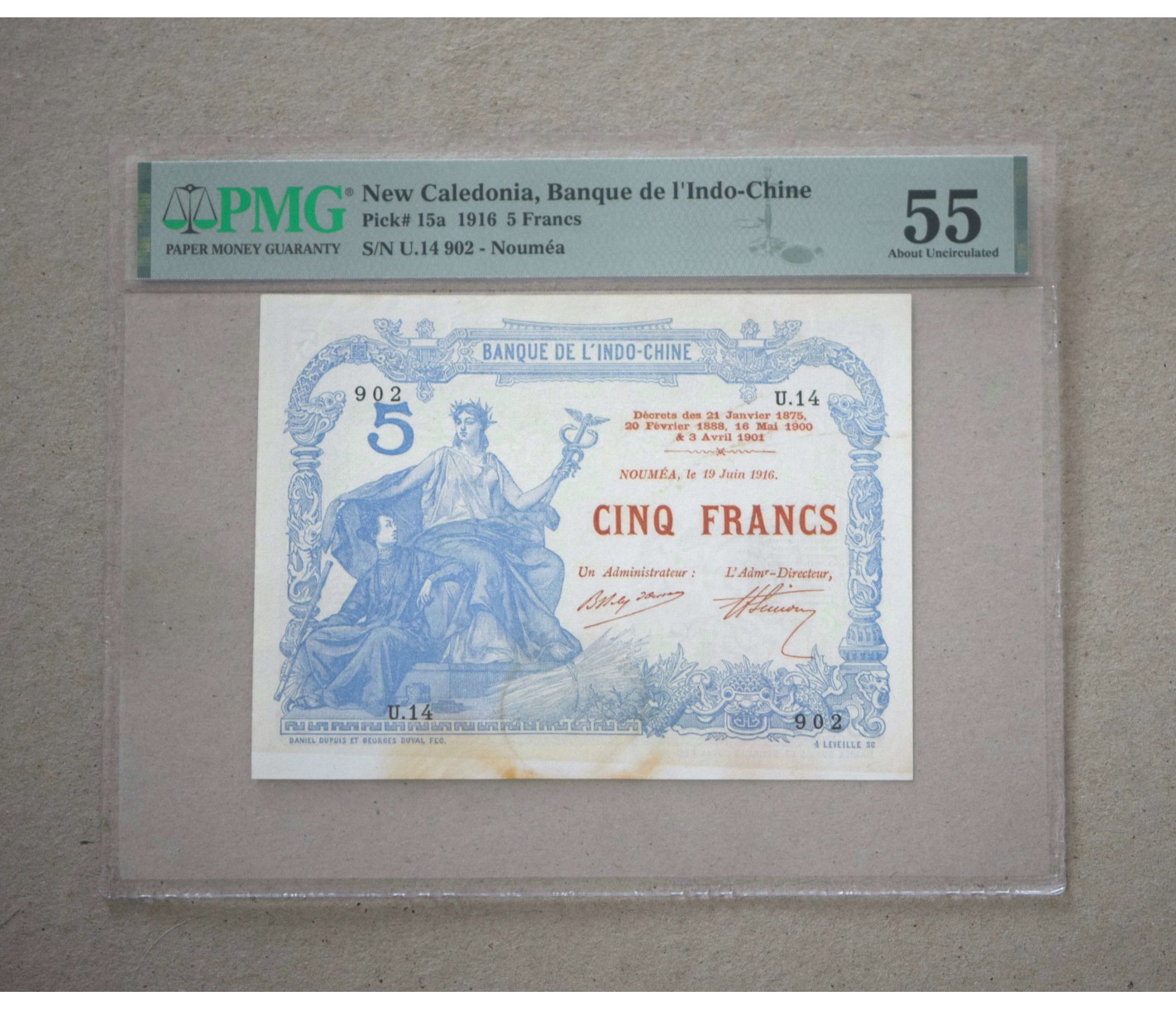Billet de 5 Francs Nouvelle Calédonie 1916P.15a, certifié PMG 55 about Uncirculed.